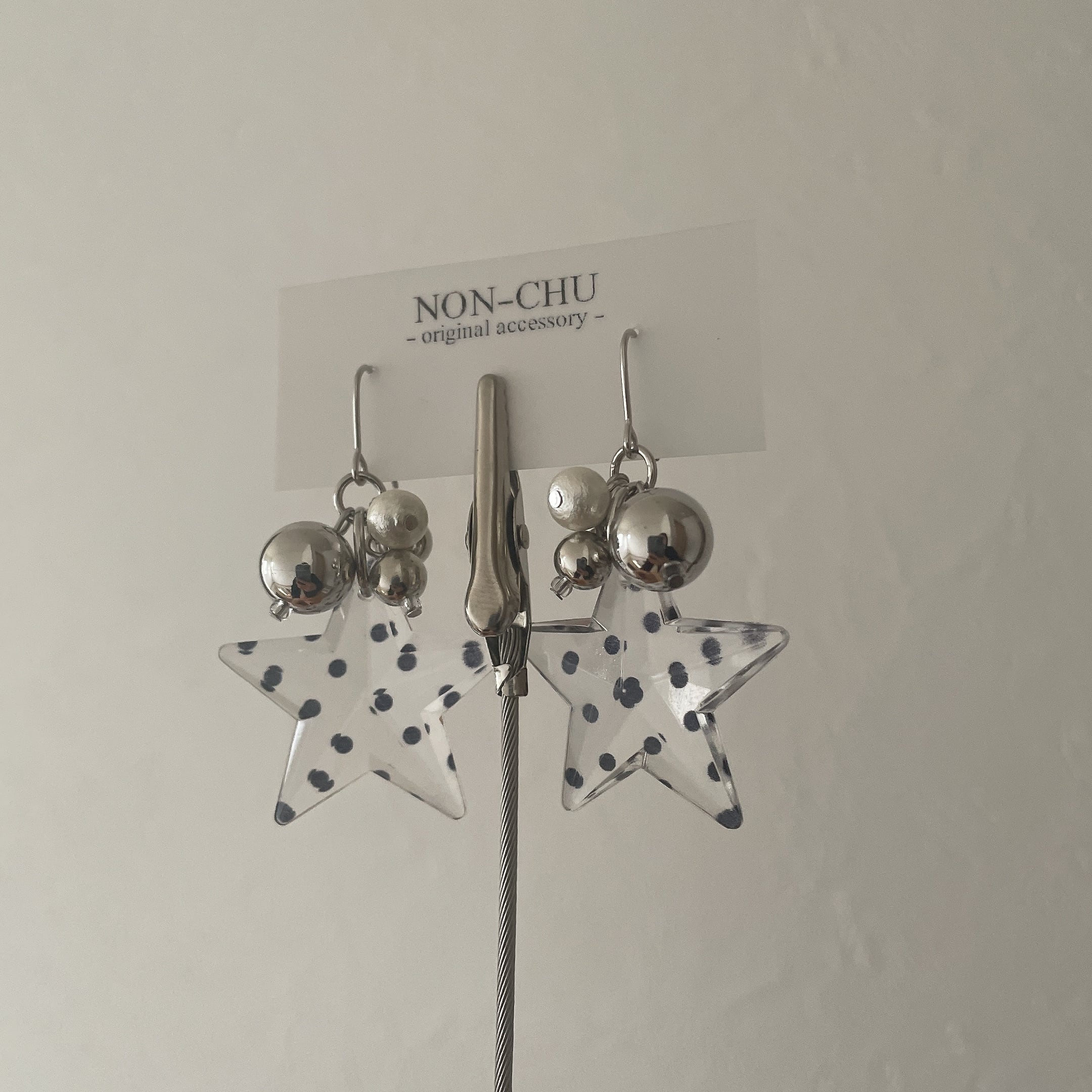 黒ドットの星が個性的で目を惹くデザインです!クリア感がこれからの時期にぴったりなピアス・イヤリングです♪